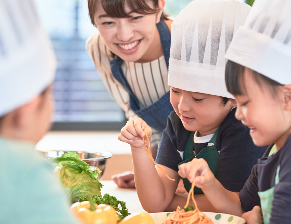 「いただきます」や「ごちそうさま」だけではなく、仲間との作業で達成感や協調性などを養うために、冷やし中華やおせち料理、カレーやサンドイッチなどの調理活動をしております。調理器具の正しい使い方や、後片付けをする手順、食事の大切さ・生き物への感謝などを学べます。